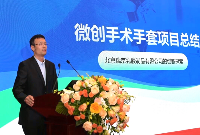 北京瑞京公司研发工程师仇维高介绍了“雪莲”微创手术手套创新研发过程。